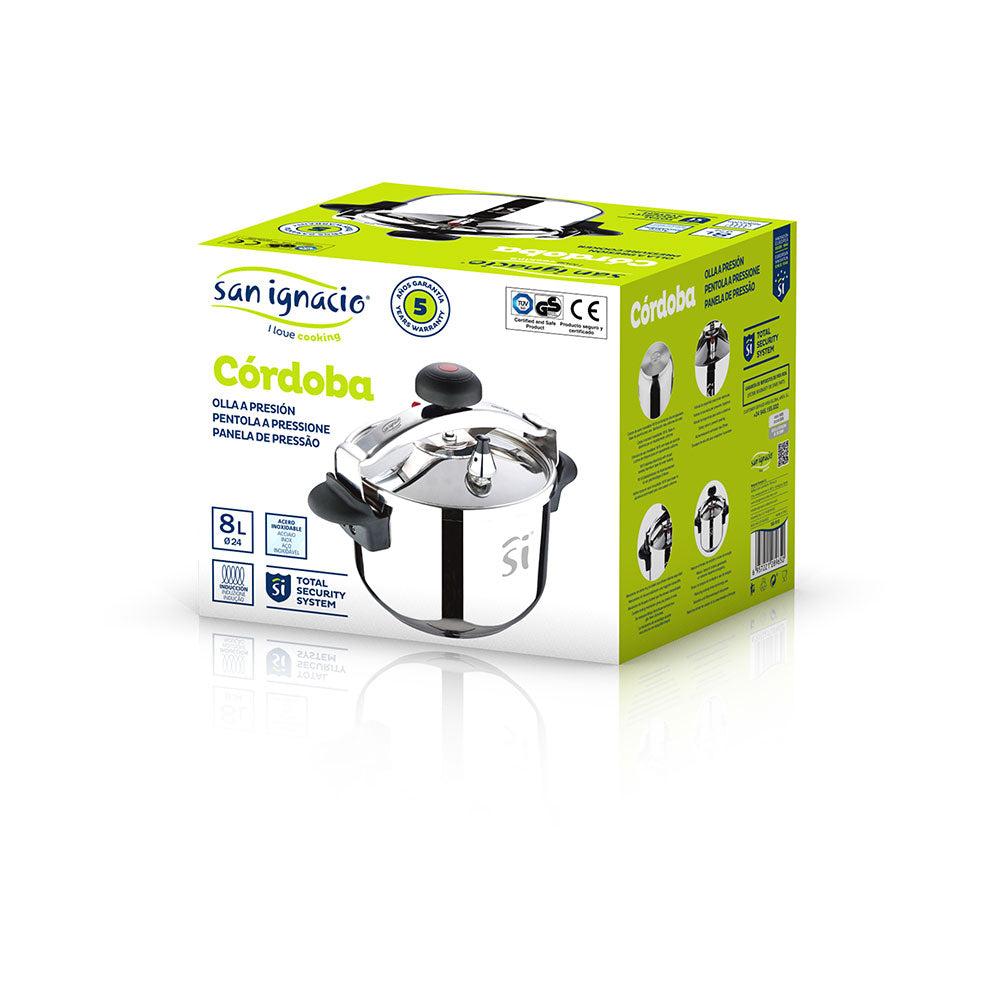 Panela de pressão ø24cm 8l inox 1mm de grossor cordoba sg1512 san ignacio. panela compatível com indução. a panela é apta para as cozinas de indução e tradicionais, isto amplia o uso aos usuários já que podem cozer de modo eficiente vários alimentos ao mesmo tempo. mecanismo de pressão. a panela rápida caracteriza-se pela eficiência ao cozinhar, isto graças à proporcional distribuição do calor no interior das paredes da mesma. grande capacidade de armazenagem. o tamanho desta panela de 8 litros permite armazenar maior quantidade de alimentos, o qual favorece uma preparação mais rápida e igual de eficiente. fabricada em inox. o seu material de fabricação encarrega-se de manter a comida em optimo estado. de igual forma, impede o desgaste da peça por calor. cabo ergonómico. o design das