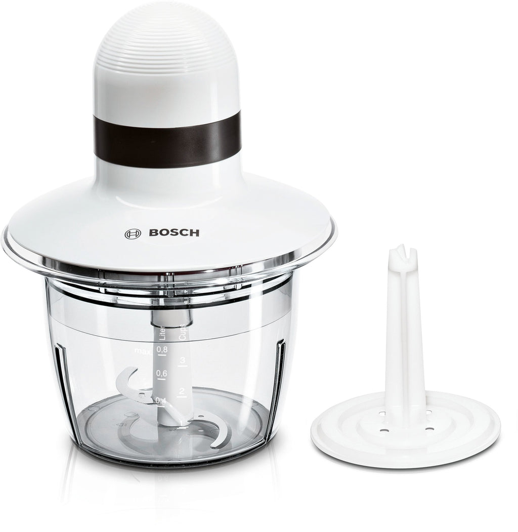 Bosch MMR08A1. Capacidade da tigela: 0,8 l. Cor do produto: Antracite, Branco, Material da taça: Plástico, Material da lâmina: Aço inoxidável. Potência: 400 W. Largura: 195 mm, Profundidade: 195 mm, Altura: 250 mm