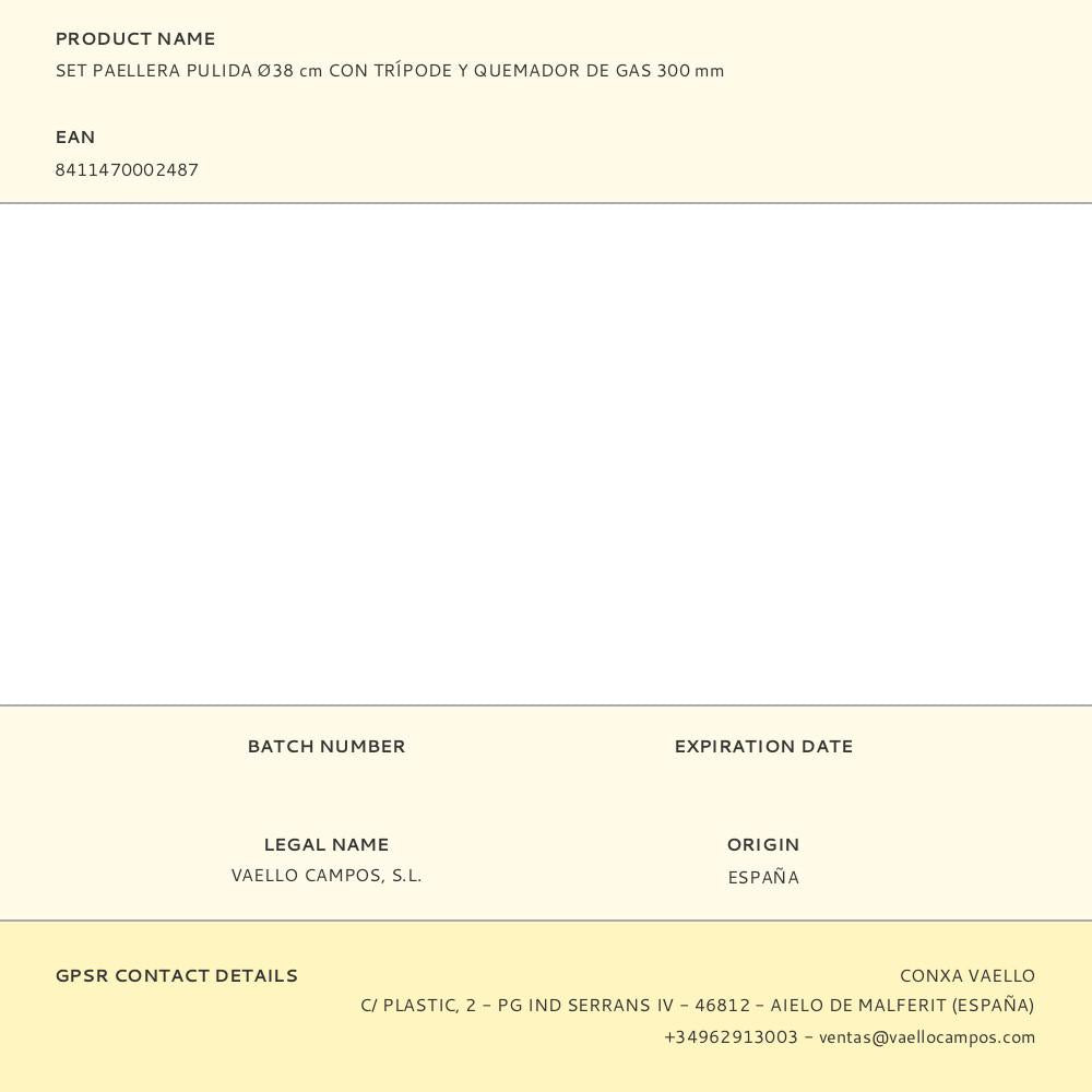 Set frigideiras polidas ø38cm com tripé e queimador de gás 300mm inclui frigideira de aço polido ø38cm aprox.8 porções altura tripé 60cm. vaello
