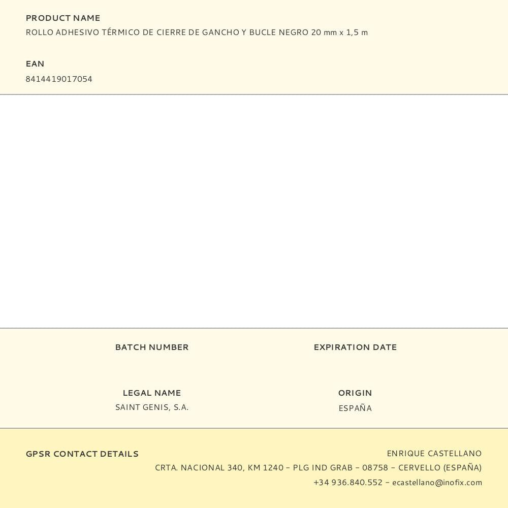 ROLO ADESIVO TÉRMICO TIPO GANCHO E BUCLE 20MMX1,5M. PRETO 2145-3.