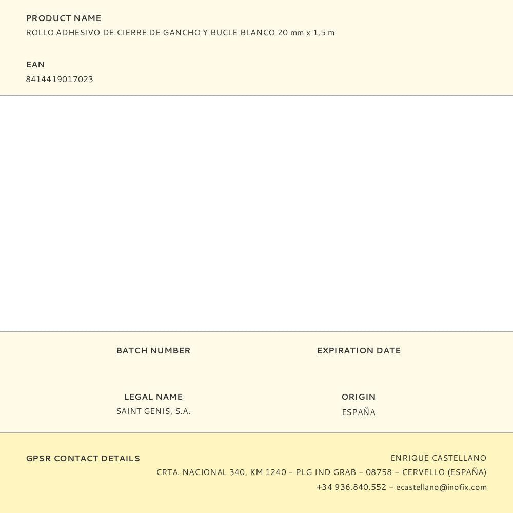 ROLO ADESIVO TIPO GANCHO E BUCLE 20MMX1,5M. BRANCO 2144-2. INOFIX
