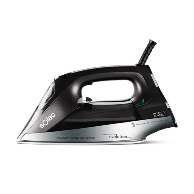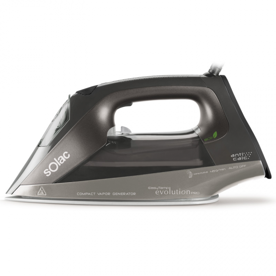 nCaracterísticasnn Centro de planchado compacton Potencia 2.400W - Autocontrol n Vapor continuo: 45 gmin n Suela Coridium Pro Drive n Regulador de vapor n Autocontrol . Tres programas predefinidos: Eco, Auto y Turbo n Máximo vapor a baja temperatura, plancha los tejidos más delicados n Vapor constante tanto en posición vertical como horizontal: 0-45 gmin n Potencia: 2400 Máx: 1600W vaporizador y 800W suela n Apta para planchar en seco n Sistema de seguridad Auto-Pause. Desconexión automática a los 8 minutos sin uso en posición vertical y a los 30 segundos en posición horizontal n Sin brillos n Sistema antigoteo n Sistema antical integrado y permanente n Avisos visuales y acústicos n Centro de planchado compacto: Centro de planchado sin calderín con generador de vapor integrado, tecnología patentada por Solac n Coridium Pro Drive. Suela con acabado cerámico con mayor deslizamiento y resistencia al rayado que las suelas tradicionales.nn