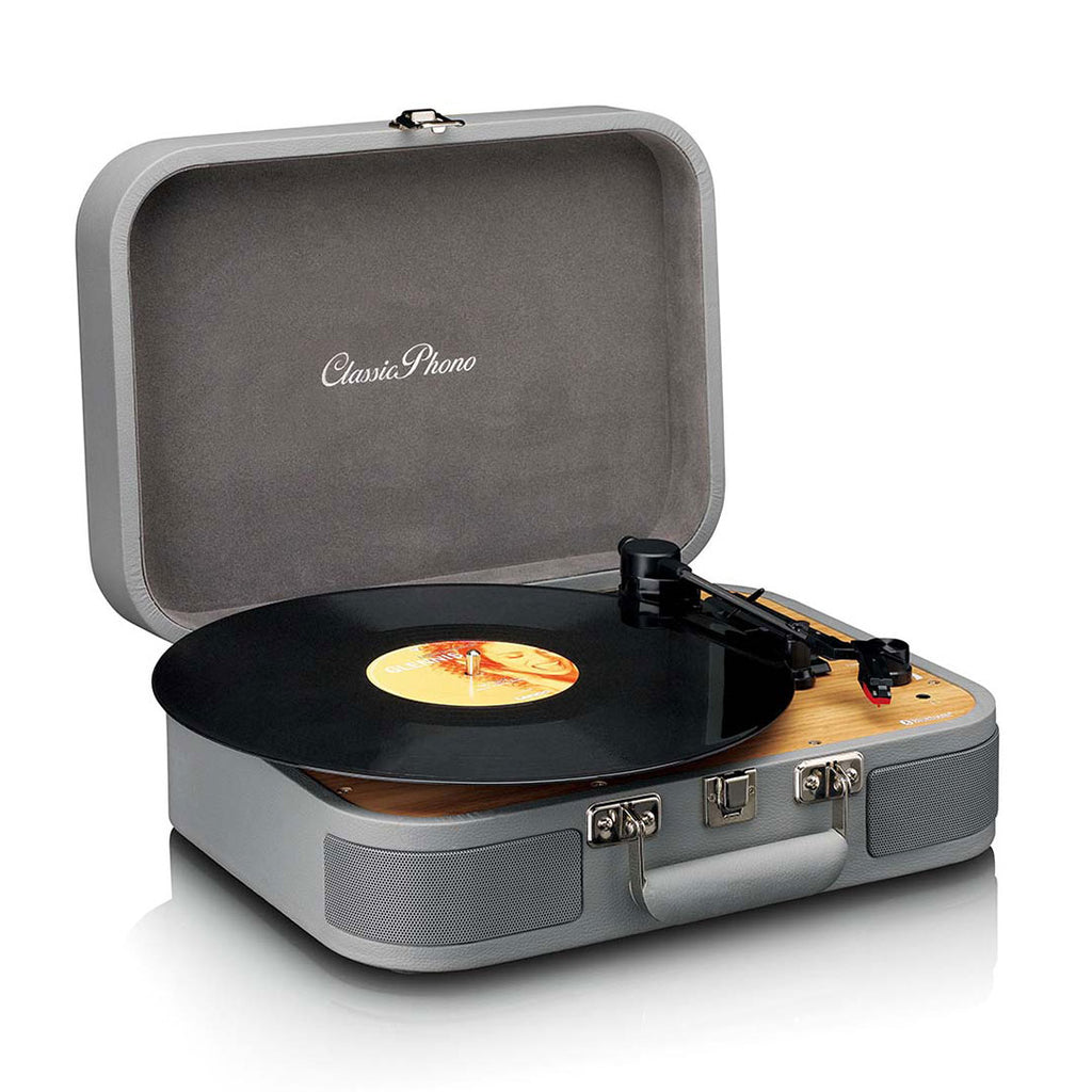 O Classic Phono TT-116GY é o chamado toca-discos de mala. É um toca-discos portátil em formato de mala. Fácil de transportar e usar. Abra a mala retro e ouça imediatamente a sua música favorita em vinil através dos altifalantes integrados. Verdadeiramente um toca-discos completo, sem necessidade de alto-falantes separados. O case sólido com alça oferece proteção ideal para o seu toca-discos.