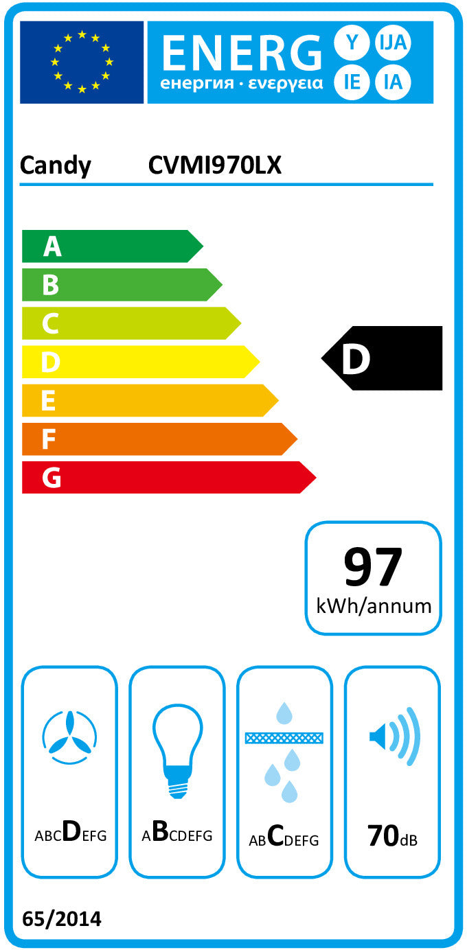 Candy CVMI 970 LX. Potência máxima de extração: 727 m³/h, Tipo de extração: Conduzido, Nível de ruído: 68 dB. Tipo: Ilha, Cor do produto: Aço inoxidável, Transparente, Material do corpo do produto: Vidro, Aço inoxidável. Tipo de filtro de gordura: Alumínio. Potência das lâmpadas: 1,5 W, Número de lâmpadas: 4 lâmpada(s), Tipo da lâmpada: LED. Potência do motor: 210 W
