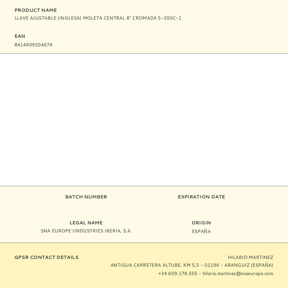 Chave ajustável moleta central 8 pol cromada. a mordaça não cai mesmo que abra a chave ao máximo. escala em mm para pré-fixar e realizar medições precisas. em pararelo com um ângulo de 15º, as mordaças oferecem um agarre firme e melhor alcance. alea nação de aço ao alto rendimento forjado numa única peça. acabamento cromado, endurecido com precisão e com tratamento anti-corrosão. normativas: iso6787, din3117, asme b107.8-2003 e bs6333. -1 blíster e 2 embalagens industriais