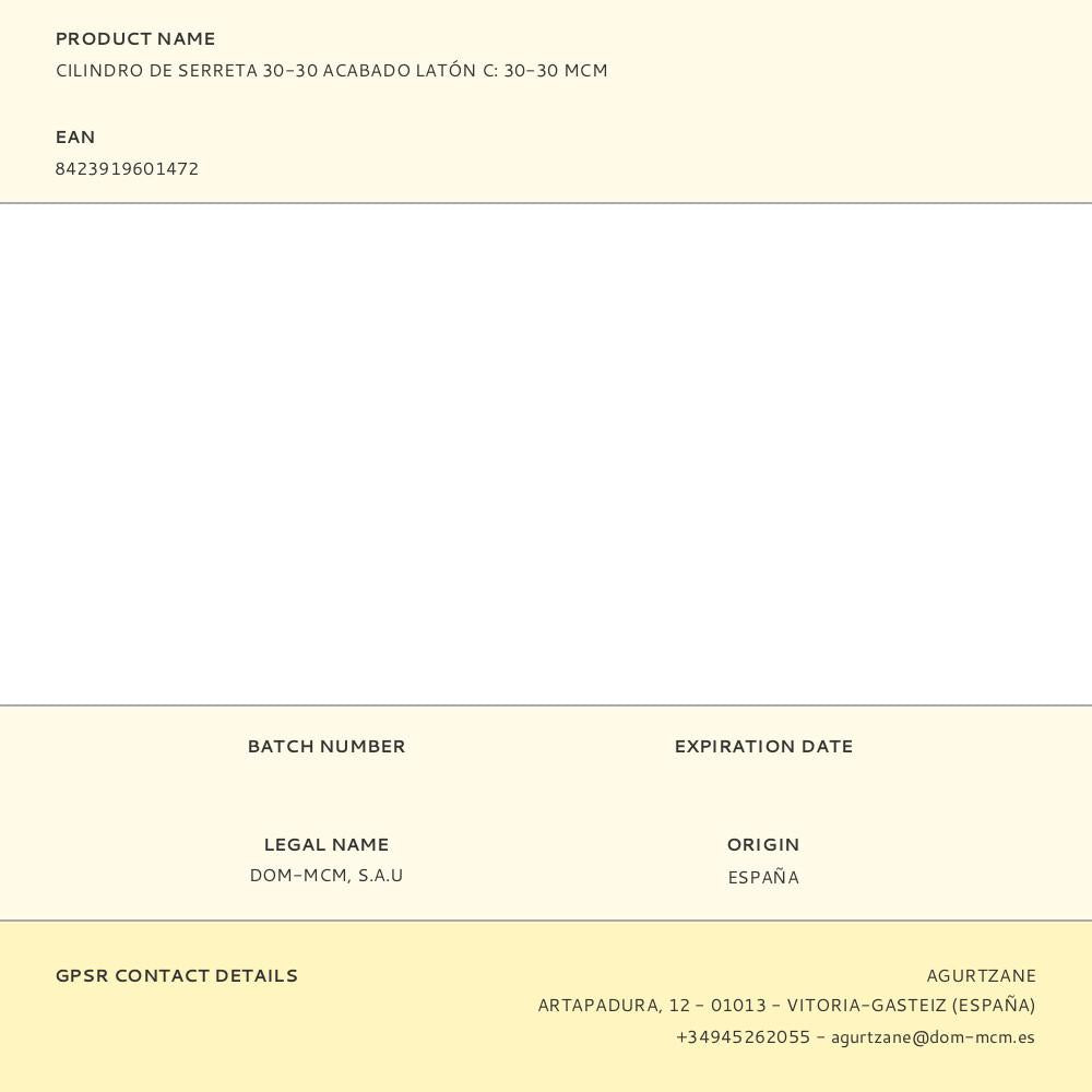 CILINDRO SERRETA 30-30 ACABAMENTO LATÃO C-30-30 MCM