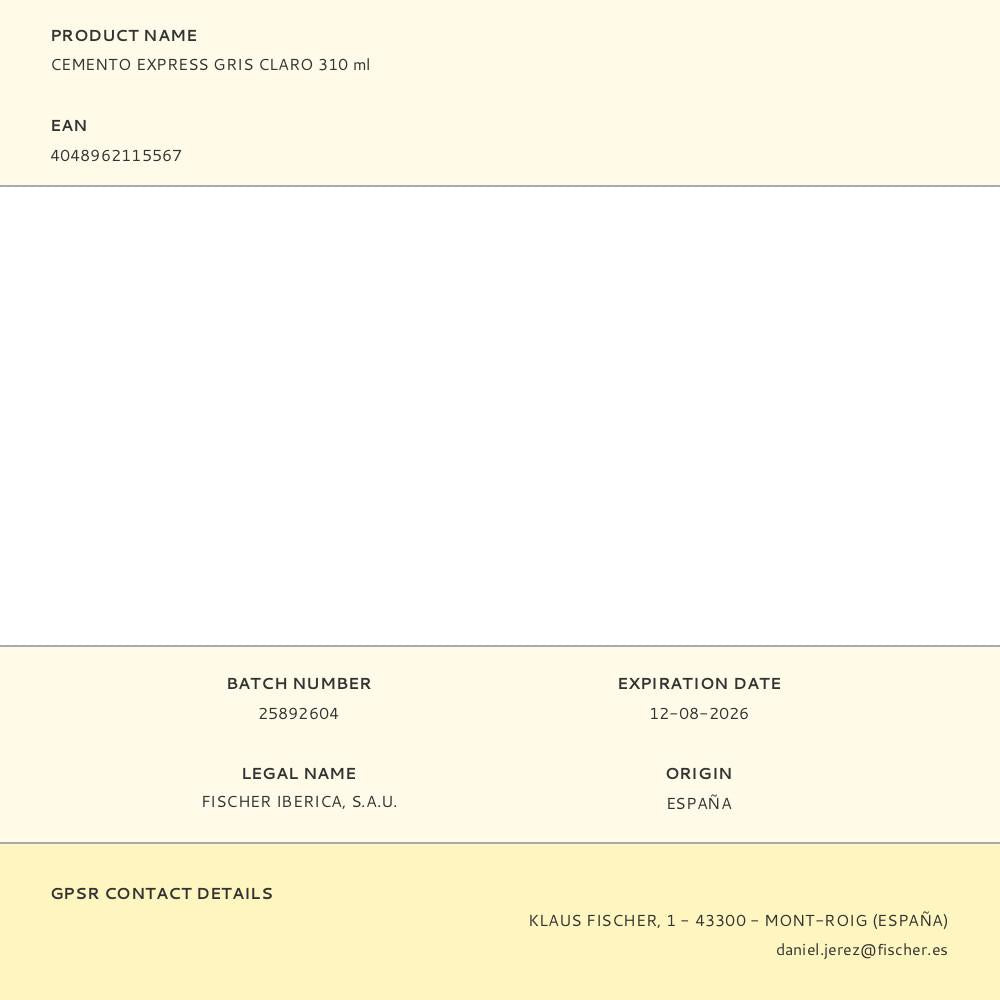CIMENTO EXPRESS CINZENTO CLARO 310ML 512352 FISCHER