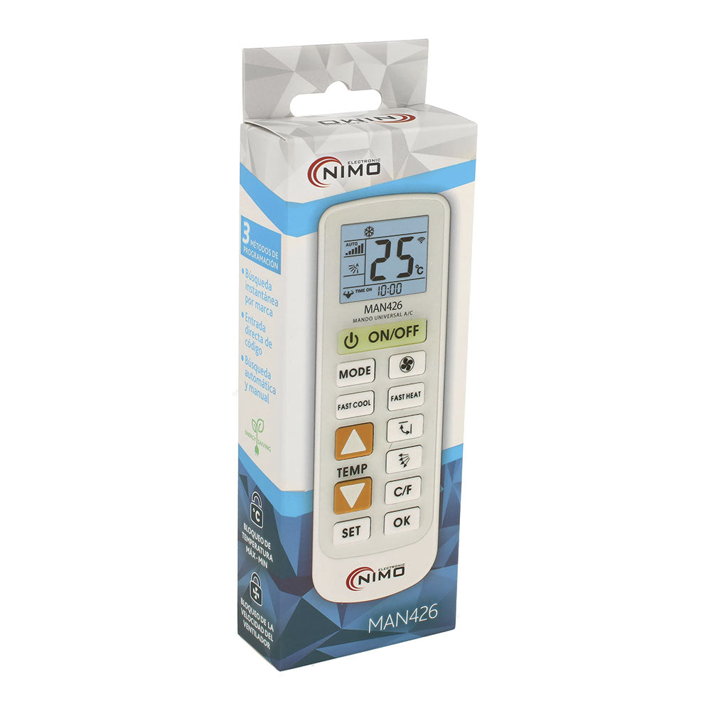 Comando universal para ar condicionado com 5000 códigos. válido para todas as marcas, opção eco, bloqueio de temperatura máx.-mín. função termómetro, ecrã iluminada, 3 métodos de programação: pesquisa instantânea por marca, entrada direta de código ou pesquisa automática e manual. fonte de alimentação 2 pilhas aaa (não incluídas).
