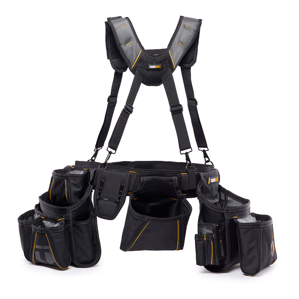 Conjunto cinto com alças pro carpinteiro de confragem. 3 malas. cinto acolchoado e alças acolchoadas. os inovadores bolsos estruturados com paineis de plástico evitam que as ferramentas caiam. 25 bolsos e suportes. o acolchoado das costas da mala evita que os bolsos batam constantemente nas pernas. comprimento do cinto regulável: extremo com acabamento de aço que permite cortar o cinto à medida, mantendo um acabamento impecável. alças acolchoadas confortáveis, pontos de tensão reforçados. as alças ergonómicas ajudam a distribuir uniformemente o peso. as 4 fivelas ajustáveis permitem pôr as alças numa posição otima. fivela extra forte de aço. apto para cinturas de 81 a 121cm/32 a 48 pulgadas