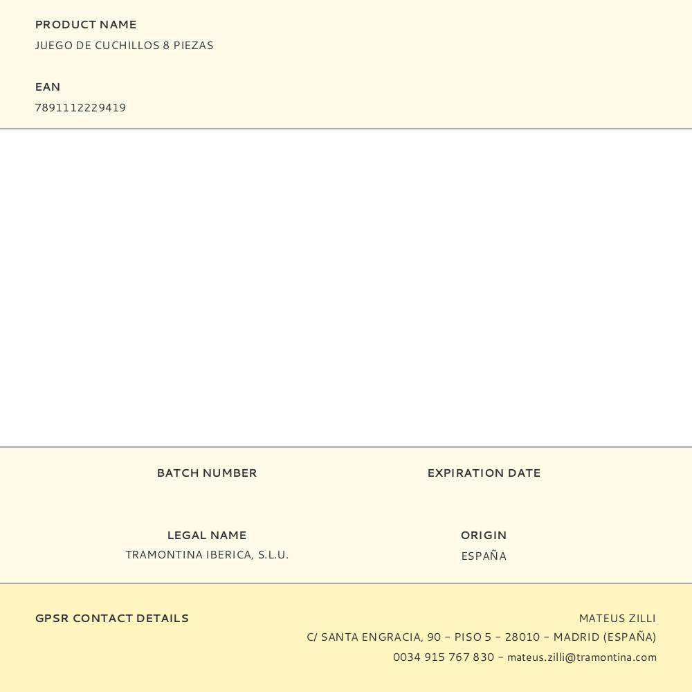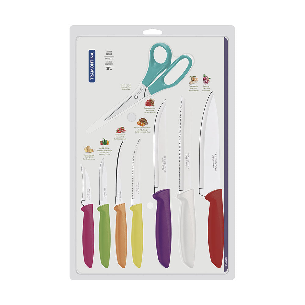 Conjunto de facas de 8 peças. contém: faca para frutas 8,2 cm / faca para assar e frutas 11,6 cm / faca para girar 7,3 cm / faca para chef 17 cm / faca para pão 16,5 cm / faca para cozinha 15,8 cm / faca para tomate 10,1 cm e tesoura 12,1 cm. material: aço inoxidável com acabamento espelhado e alça em polipropileno. cores variadas