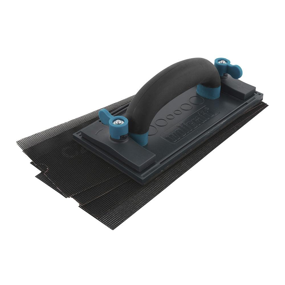 Lixadora conjunto de 5 peças para lixar placas de gesso. inclui uma lixadora manual com superfície de 110 x 230 mm, duas lixas de grão 120 / 115 x 280 mm e duas lixas de grão 220 / 115 x 280 mm