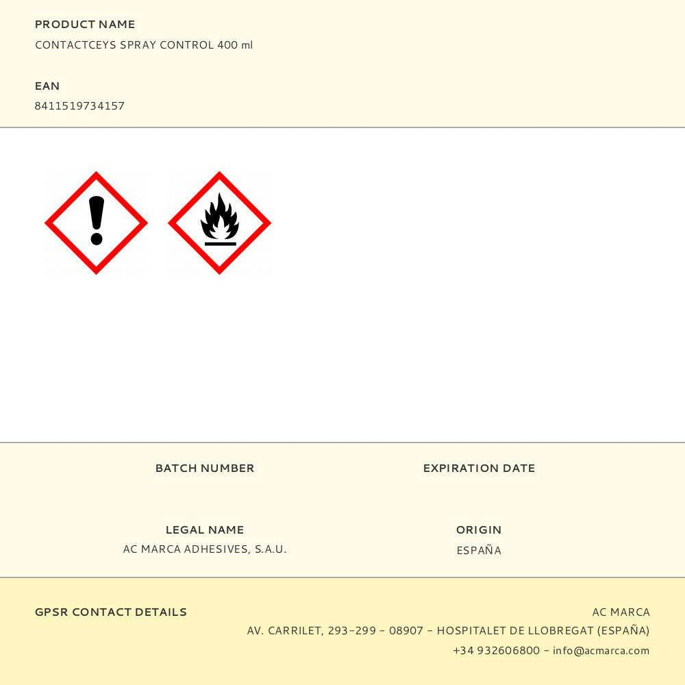 Contactceys spray control 400 ml. cola de contado em base neopreno, polivalente e de uso geral para unir multitudes de materiais. proporciona uniões resistentes, flexiveis e duradeiras. em especial proporciona insuperaveis resultados para colar couro pele, madeira, borracha, caucho, etc
