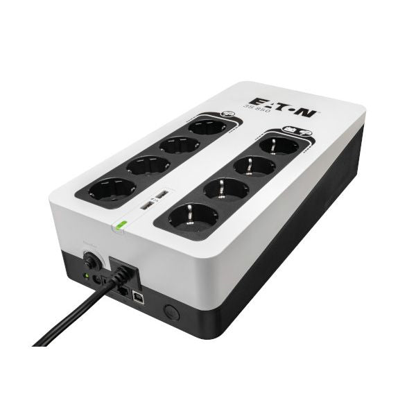 Eaton 3S850D. Topologia UPS: Em espera (Offline), Capacidade de energia de saída: 0,85 kVA, Potência de saída: 510 W. Quantidade de saídas AC: 8 tomada(s) CA. Tecnologia da bateria: Chumbo-ácido selado (VRLA). Cor do produto: Preto, Branco, Comprimento do cabo: 1,5 m, Segurança: IEC 62040-1; IEC 62040-2 C2; IEC 62040-3; IEC 62040-4; IEC 61643-11. Largura: 335 mm, Profundidade: 170 mm, Altura: 86 mm
