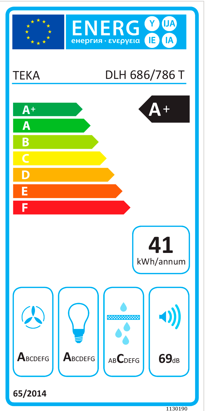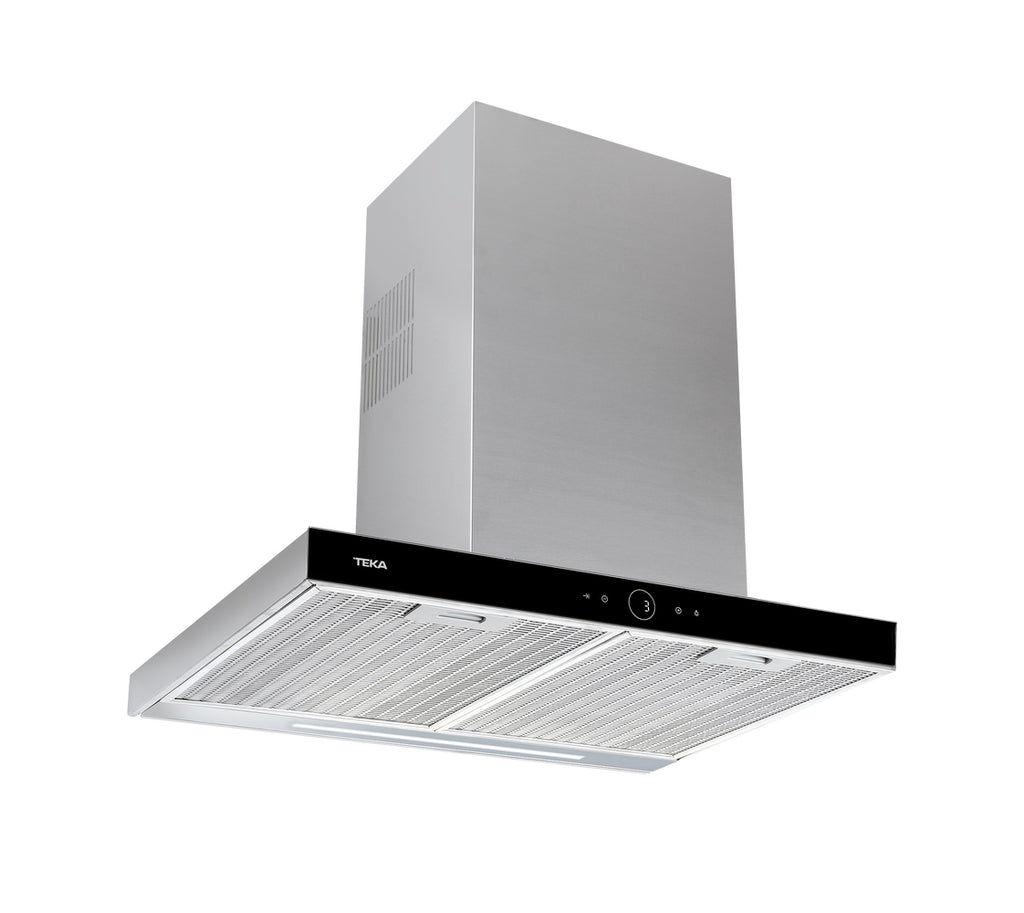Teka DLH 686 T. Potência máxima de extração: 701 m³/h, Tipo de extração: Conduzido/recirculante, Classe Eficiência Dinâmica Fluídos: A. Tipo: Montado na parede, Cor do produto: Preto, Aço inoxidável, Tipo de controlo: Toque. Tipo de filtro de gordura: Aço inoxidável, Número de filtros: 3 unidade(s). Potência das lâmpadas: 6 W, Tipo da lâmpada: LED, Iluminação: 296 lx. Classe de eficiência energética: A+, Consumo de energia anual: 40,7 kWh, Potência do motor: 265 W