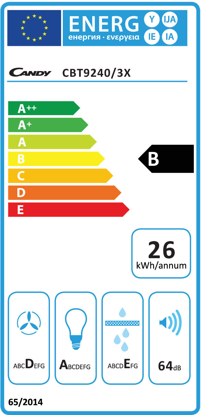 Candy CBT9240/3X. Potência máxima de extração: 329 m³/h, Tipo de extração: Conduzido, Classe Eficiência Dinâmica Fluídos: D. Tipo: Semi embutido (deslizante), Cor do produto: Prateado, Material do corpo do produto: Ferro. Tipo de filtro de gordura: Alumínio/Carbono. Potência das lâmpadas: 2 W, Tipo da lâmpada: LED. Classe de eficiência energética: B, Consumo de energia anual: 26 kWh, Escala de eficiência energética: A+++ a D