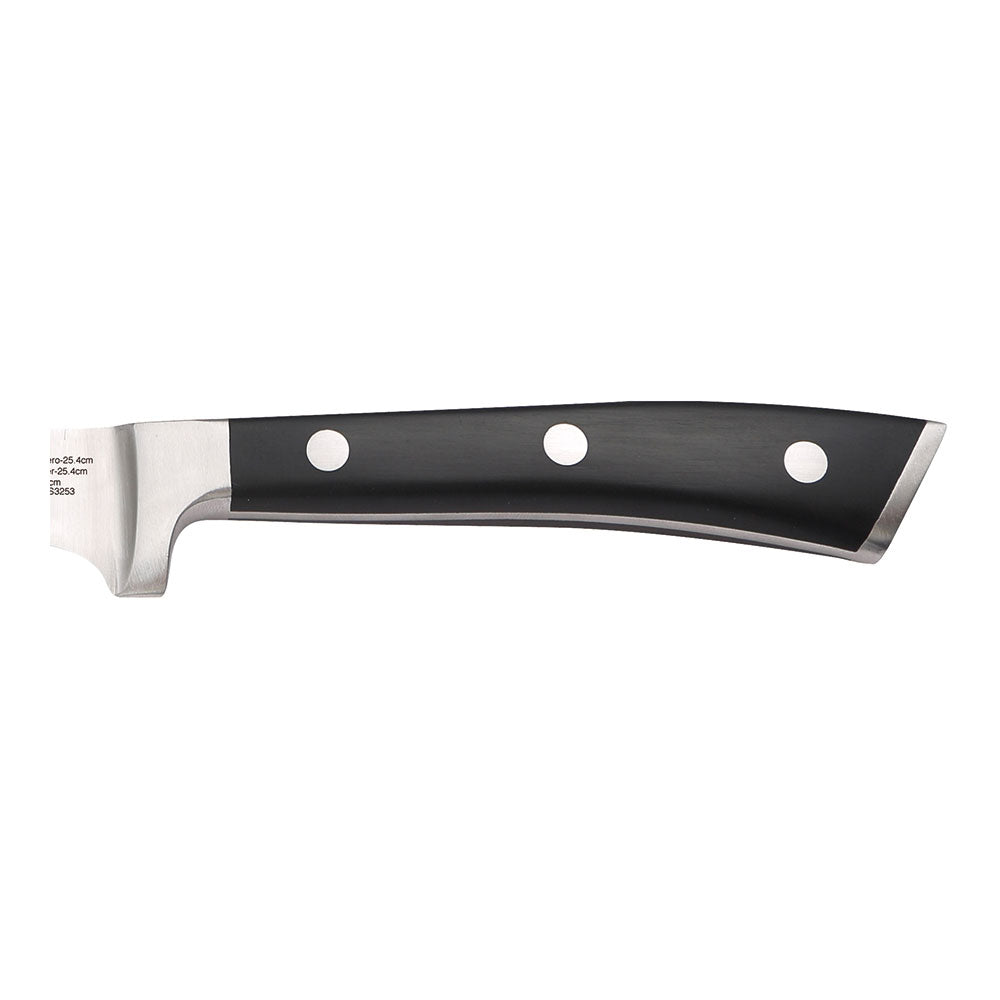 Faca para presunto inox foodies 25,4 cm. fabricado em inox de alta qualidade para maior vida útil. a lâmina foi desenvolvida para poder cortar sem esforço o presunto. comprida e flexível. é perfeita para a tarefa. o cabo da peça conta com um design ergonómico facilitando um agarre suave e oferecendo o controle total sobre a peça e o corte. apta para máquina lava-loiças