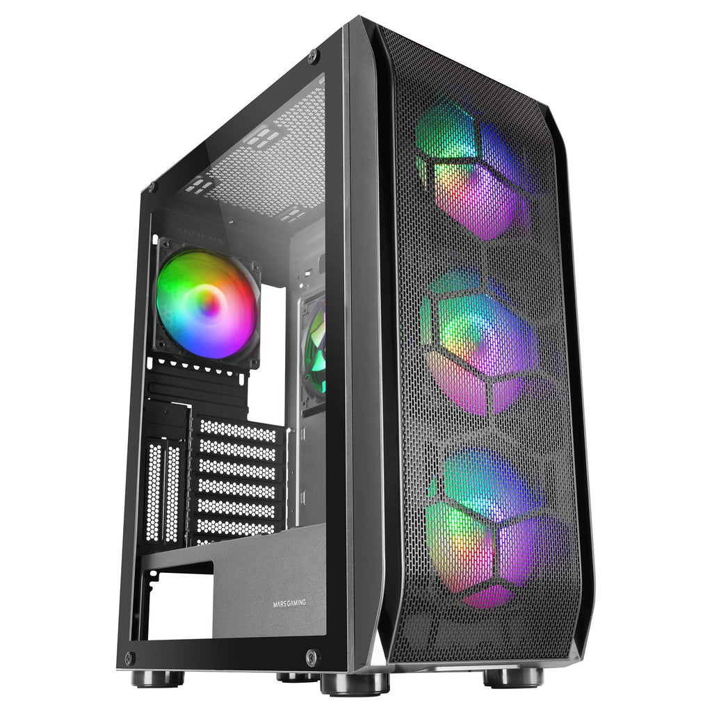 Mars Gaming MCKX. Forma: Tower, Tipo: PC, Cor do produto: Preto. Ventoinhas frontais instaladas: 3x 120 mm, Ventiladores laterais instalados: 1x 120 mm, Diâmetros de ventiladores laterais compatíveis: 120 mm. Tamanhos de drives de discos rígidos compatíveis: 3.5", Fator de forma SSD: 2.5". Largura: 210 mm, Profundidade: 397 mm, Altura: 490 mm. Comprimento da embalagem: 532 mm, Profundidade da embalagem: 268 mm, Altura da embalagem: 456 mm