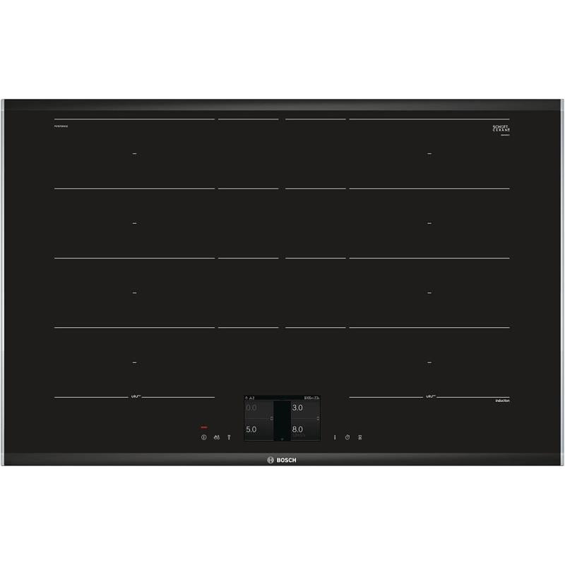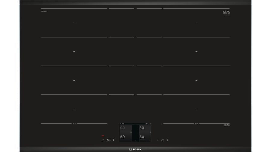 SER8, Placa FlexInduction, 80 cm, Comfort Design, 2 zonas Flex+zona extensível, TFT-touchdisplay, HC (conexão placa-exaustor), MoveMode, PowerTransfer, PerfectFry, PerfectCook, PowerBoost, PanBoost, Manter quente, programação do tempo, ReStart, QuickStart, ind. consumo energia