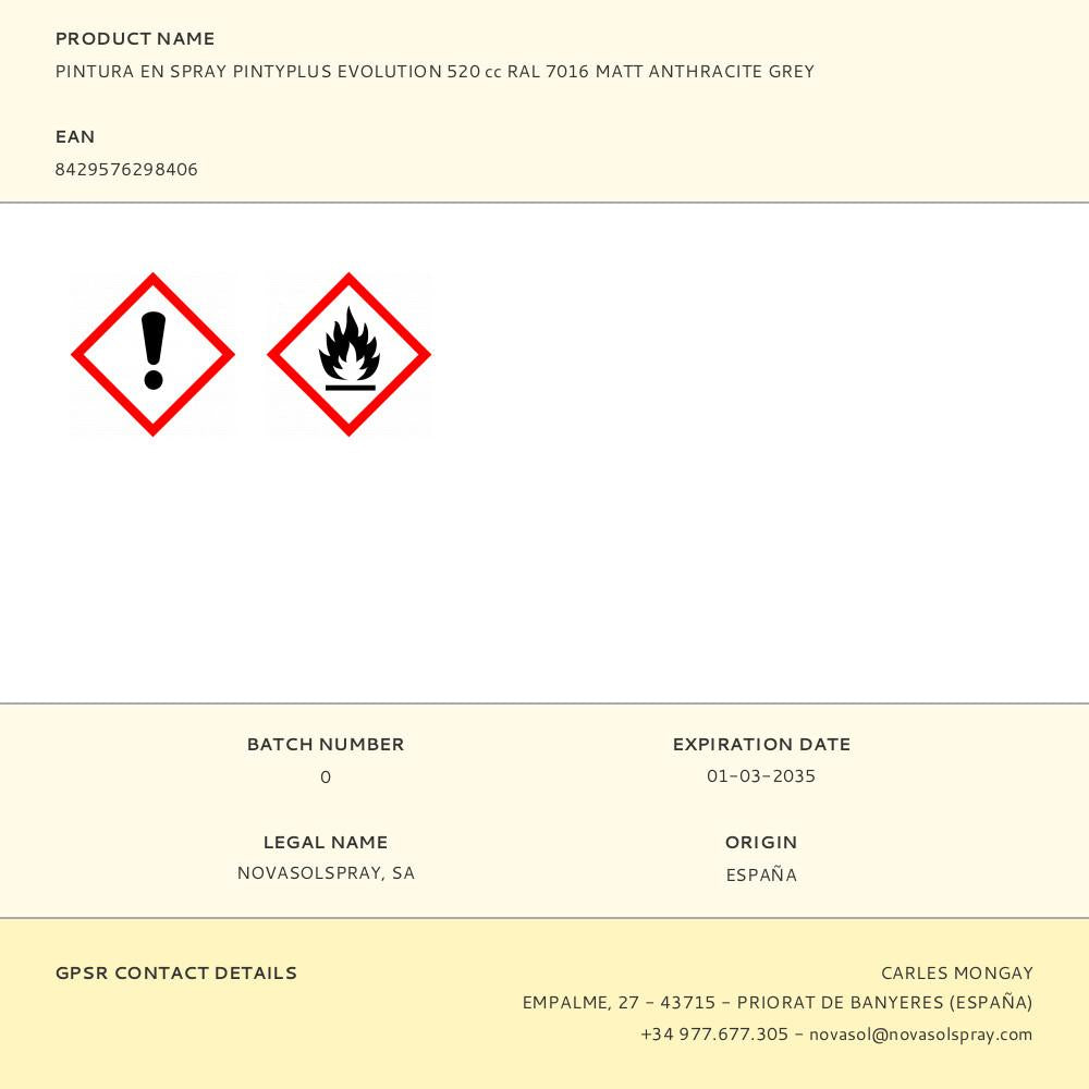 TINTA EM SPRAY PINTYPLUS EVOLUTION 520CC RAL 7016 MATT ANTHRACITE