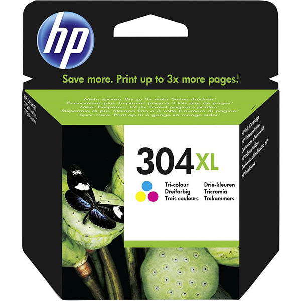 HP Tinteiro original 304XL Tricolor. Tipo de cartucho: Rendimento alto (XL), Tipo de cor de tinta: Tinta baseada em corante, Capacidade de páginas de cor: 300 páginas, Volume da tinta de cor: 7 ml, Quantidade por conjunto: 1 unidade(s)