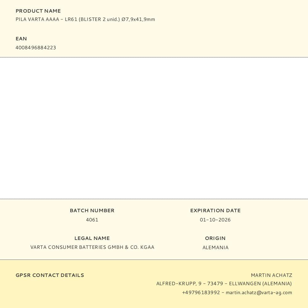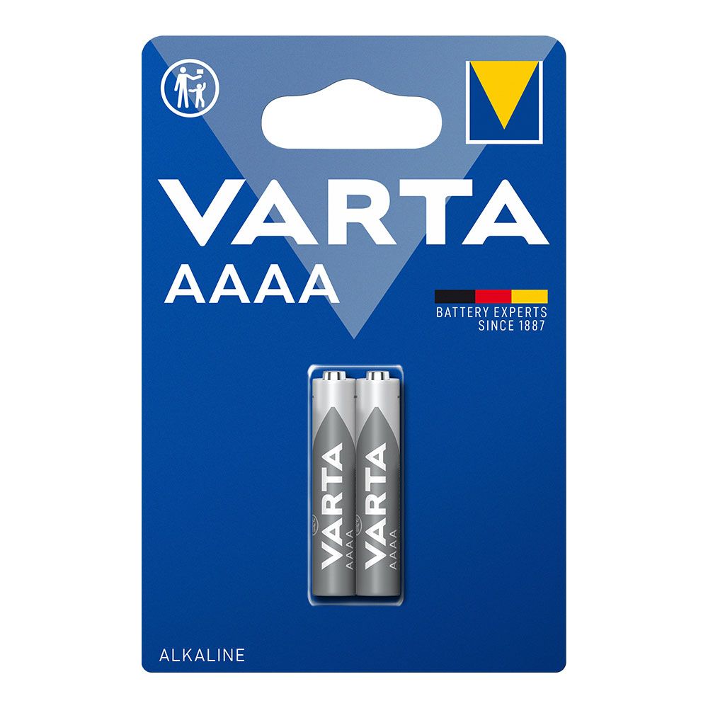 Varta 4061 101 402. Tipo de bateria: Bateria descartável, Tamanho da pilha: AAAA, Tecnologia da bateria: Alcalino. Altura: 40,2 mm, Diâmetro: 8,2 mm, Peso: 6 g. Comprimento da embalagem: 80 mm, Profundidade da embalagem: 10 mm, Altura da embalagem: 120 mm. Factor de forma de bateria: Cilíndrico
